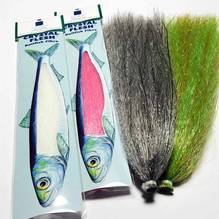 Crystal Flesh is a baitfish fibre providing the perfect silhouette with great movement and natural fish flesh appearance.