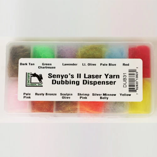 The Senyo Laser Yarn Dubbing Dispenser includes a 12 compartment dubbing box filled with some of the favorite colors of the popular Senyo Laser Yarn dubbing from Hareline