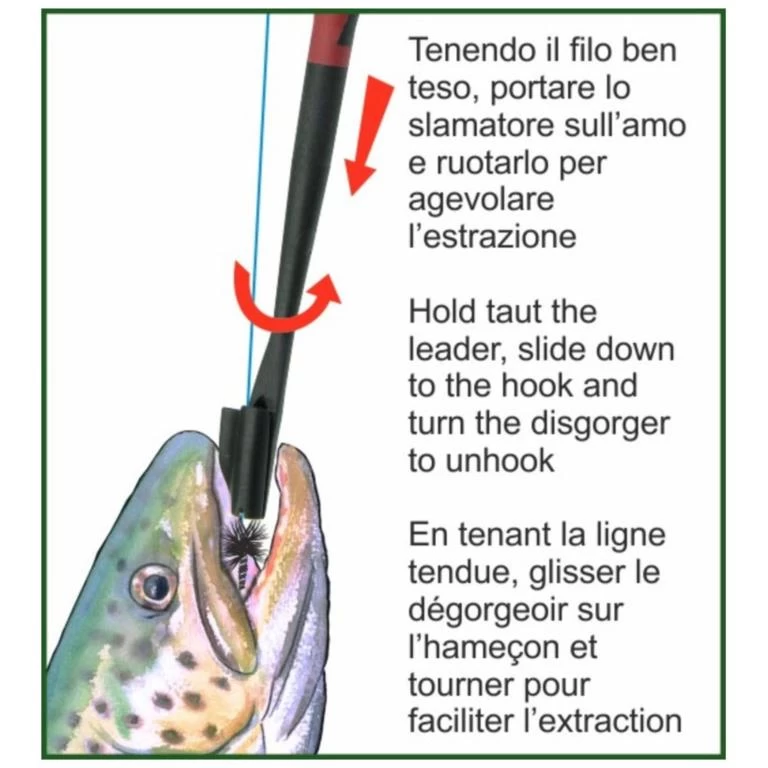 High quality disgorger with shaped tubular head, designed for a quick hook release without damaging fly or fish. Produced with very strong material and with anatomic rubber handle. Fantastic for every kind of fishing it is indispensable for the catch and release. Equipped with eyelet to hang it on a tool holder.