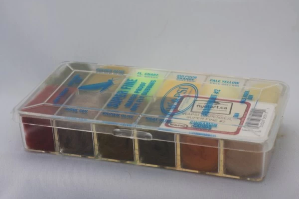 Super Fine Dubbing is a permanently waterproofed 1.2 denier, 1.5″ staple synthetic material. It makes fantastic tight bodies on dries past size 28. Great hatch matching colors.