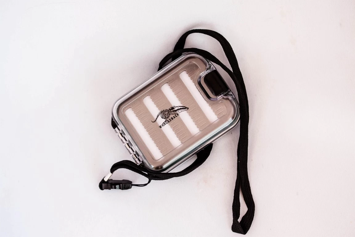 Small double sided waterproof box with quick disconnect lanyard. Designed with wading in mind. measures 3.5″x3x1.5″