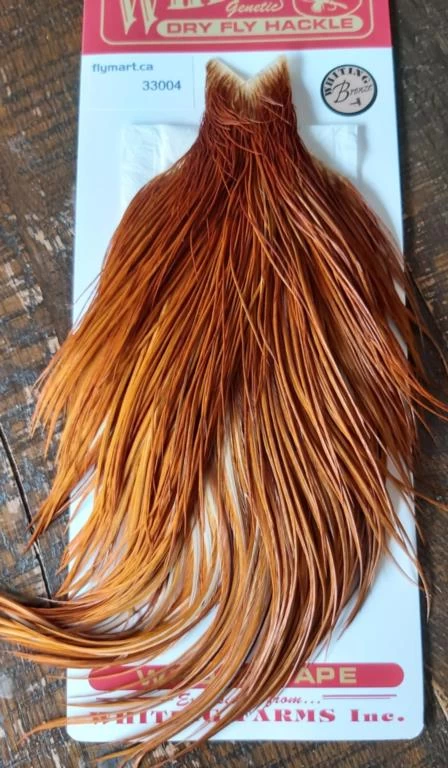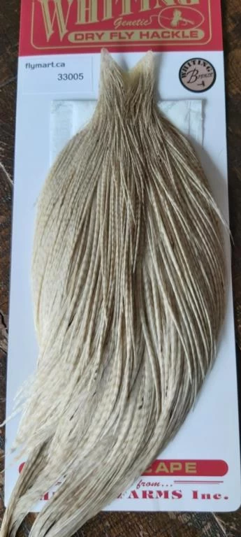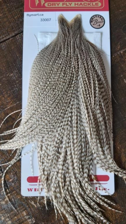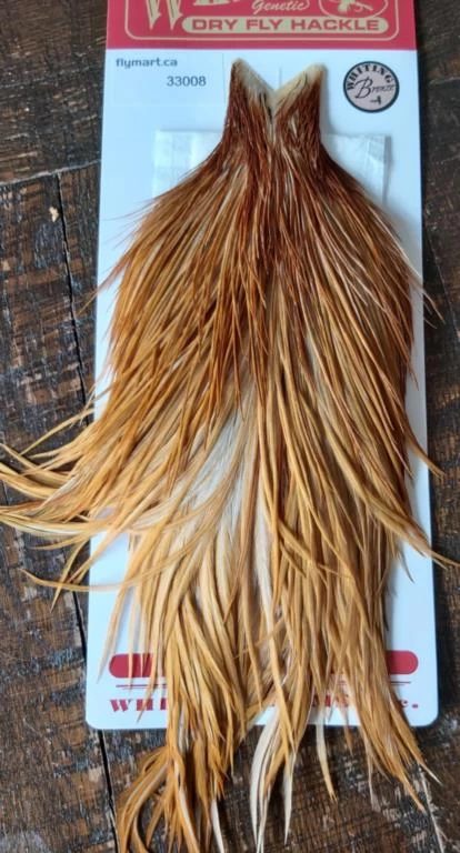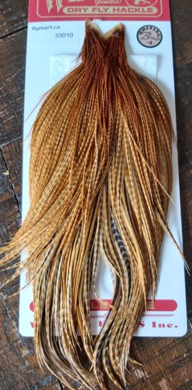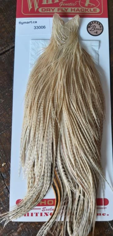 Whiting dry fly capes are the ultimate in dry fly tying. With long supple quills and incredible barb density capable of tying down to size 24 and even smaller, Whiting genetic dry fly hackle is the connoisseur’s choice for fly tying. This product line derives its heritage from the legendary Hoffman grizzly super hackle stock. Only Whiting Farms has this incredible genetic stock to offer you.